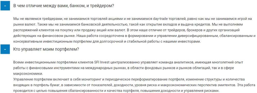 Условия, которые предлагают жулики СФИ Инвест инвесторам, можно описать как "бла-бла-бла". На сайте вообще сложно найти информацию по существу, одни россказни о какой-то команде чудо-аналитиков, которая всесторонне анализирует рынок и формирует портфель из неизвестных акций и фьючерсов американского рынка, очень доходный и ликвидный.