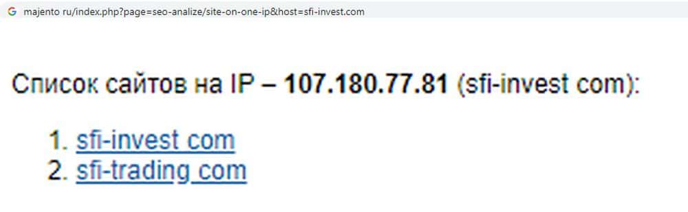 Может, мошенники СФИ Инвест использовали регистрационные данные реально существующей компании, чтобы придать своему скам-проекту достоверности? Обращаемся к сервису majento ru и выясняем, что оба сайта - sfi-invest com и sfi-trading com - сидят на одном IP. То есть, обе конторы действительно принадлежат одному хозяину.