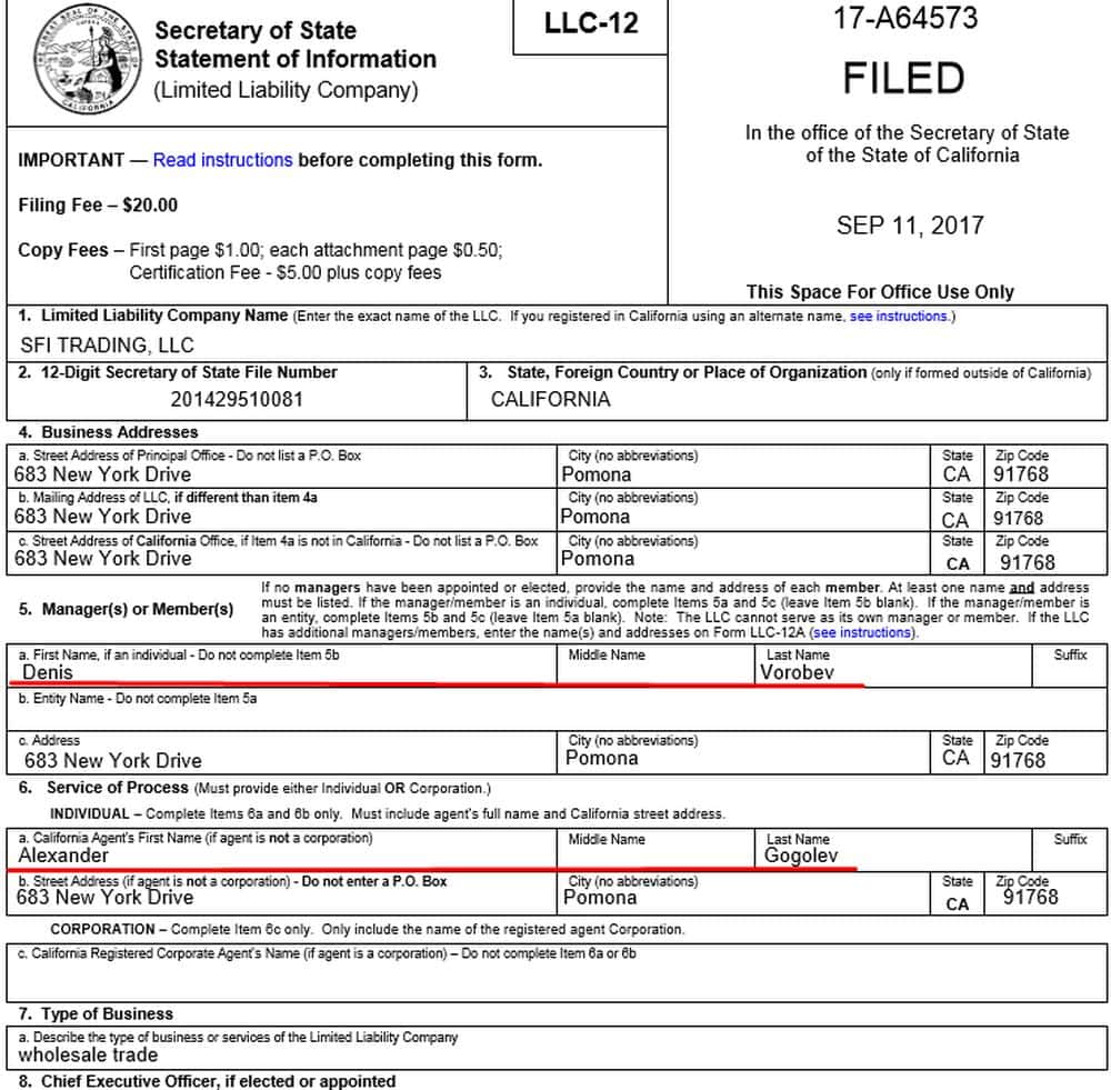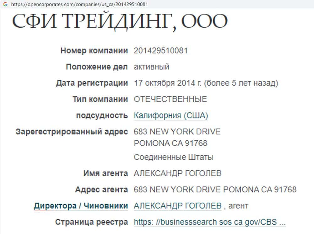 Но на самом деле у инвестиционной шарашки есть руководители, правда, по документам они управляют не лохотроном СФИ Инвест, а складом арахисового масла в Калифорнии. Это некие Денис Воробьев и Александр Гоголев. По документам они занимаются оптовой торговлей, но материнская контора может быть таким же лохотроном.