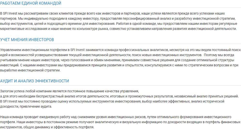 Вполне ожидаемо, что о руководстве жулики SFI Invest на сайте не сказали ничего. Они вообще не дают обычной для брокера информации (ну да, они же не брокер), так что понять инвестора, который решится вложиться в шарагу, сложно. Веселят заявления катал СФИ Инвест о мифической дружной команде опытных аналитиков без единого имени и фотографии.