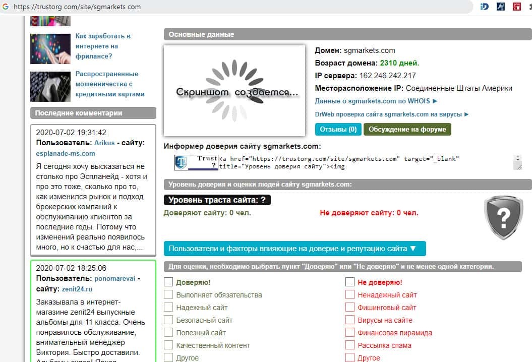 Согласно данным с уважаемого веб-сервиса trustorg com, возраст домена ресурса дилинговой конторы SGMarkets составляет 2310 дней и располагается в США. Но при этом невозможно проследить абсолютно ничего о сервисе слившегося форекс брокера: у него нет ни оценок, ни комментариев в системе. В общем, мошенники стерли о себе все сведения, чтобы исчезнуть.