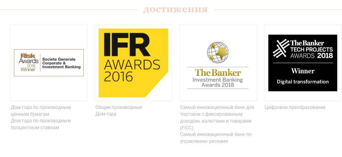 И заканчивает веб-страница грабительского форекс брокера СГ Маркетс очень интересным разделом "Достижения", который посвящен тому, что мошенники описывают уйму своих достижений и побед, которые явно не являются правдивыми. Они приписали себе звание от Дома года по производным ценным бумагам до Самого инновационного банка по управлению рисками.