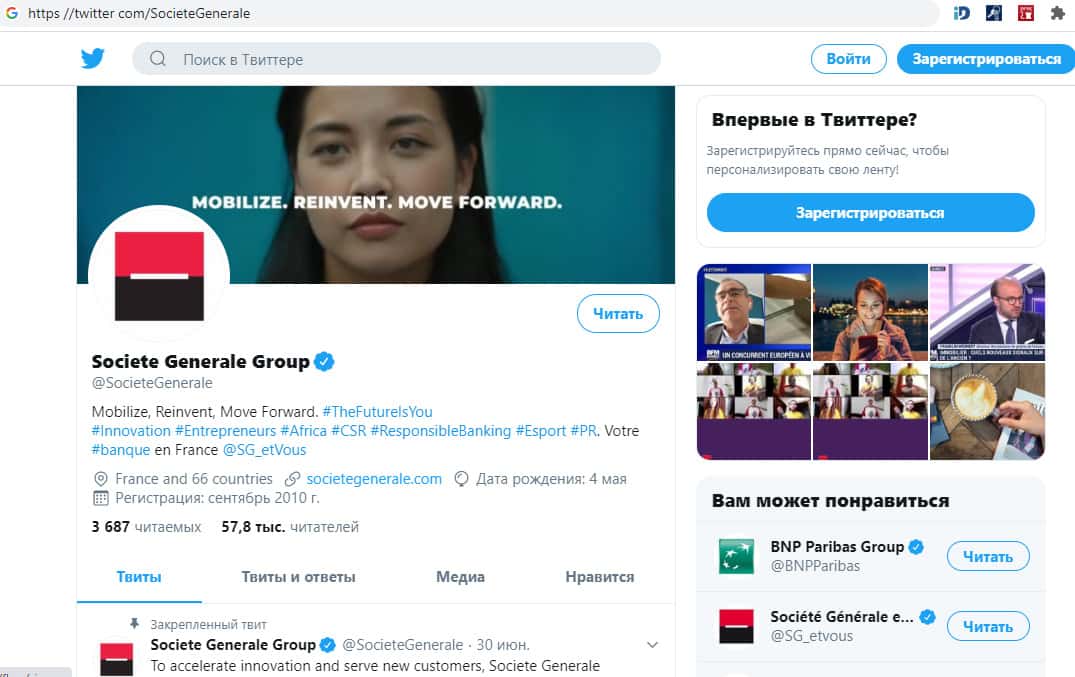 Следующей социальной сетью, в которой ворюги из форекс дилинговой компании SGMarkets решили попытать счастье в продвижении своих брокерских услуг и заманивании в ловушку несчастных биржевых игроков стал Твиттер. Количество читателей достигает 57,8 тысяч читателей. Но это все нереальные люди. Адрес шараги twitter com/SocieteGenerale