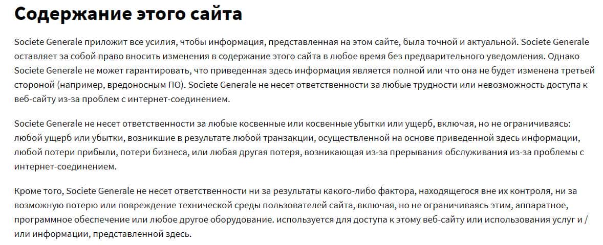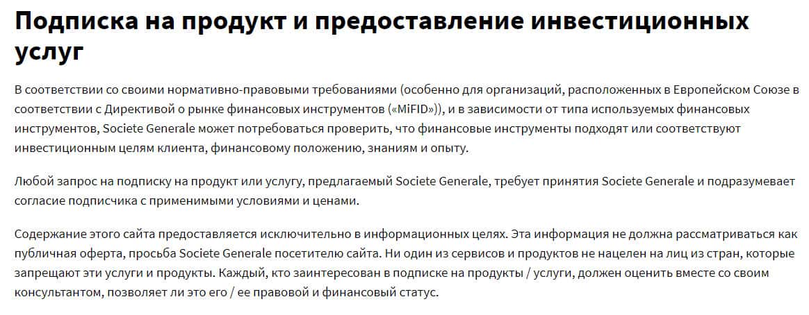 Далее в разделе "Подписка на продукт и предоставление инвестиционных услуг" клиентского соглашения липовой брокерской структуры SGMarkets идет речь о том, что содержание этого ресурса предоставляется исключительно в информационных целях. Эта информация не должна рассматриваться как публичная оферта. В общем, прикрывают все свои стороны махинаторы.