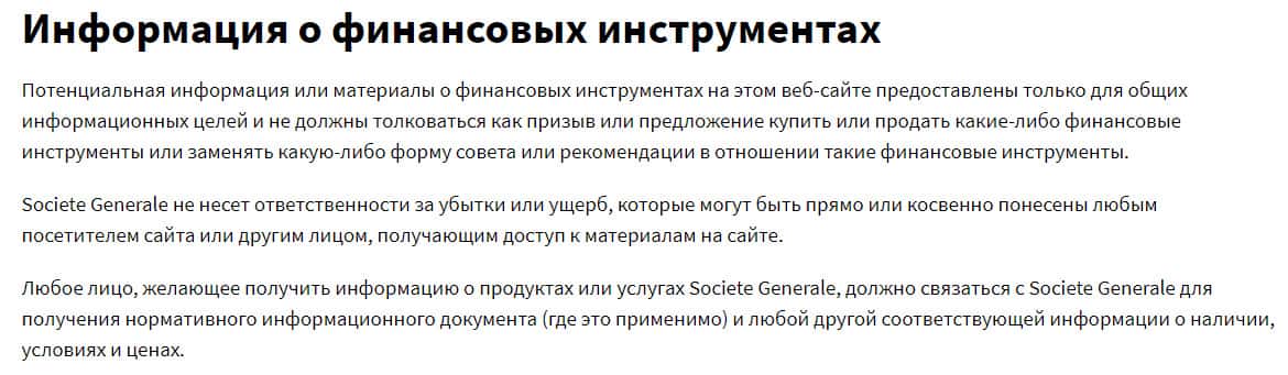 В разделе "Информация о финансовых инструментах" говорится о том, что лжеброкер SGMarkets не несет ответственности за убытки или ущерб, которые могут быть прямо или косвенно понесены любым посетителем сайта или другим лицом, получающим доступ к материалам на интернет-портале.