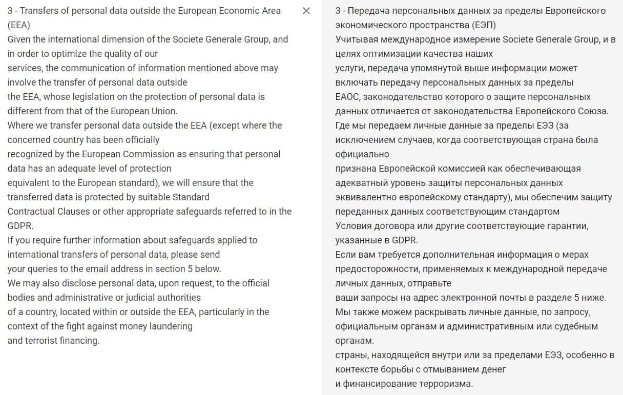 В 3-м разделе "Передача персональных данных за пределы Европейского экономического пространства" идет речь о том, что мошенническая контора СГ Маркетс вправе передавать данные трейдеров другим компаниям и лицам, при этом никто не может гарантировать конфиденциальность и безопасность передачи таких данных. В общем, сплошной обман и разводняк.