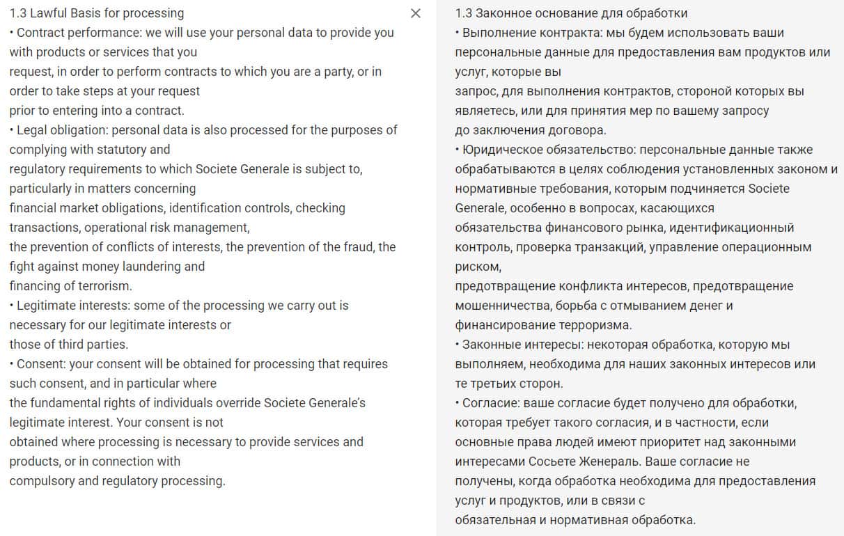 В пункте 1.3 говорится о том, что сомнительный форекс дилер СГ Маркетс используют следующие якобы законные основания для обработки персональных данных о валютных игроках: для правильного предоставления необходимой информации и услуг клиента, для защиты законных интересов брокера и третьих лиц.