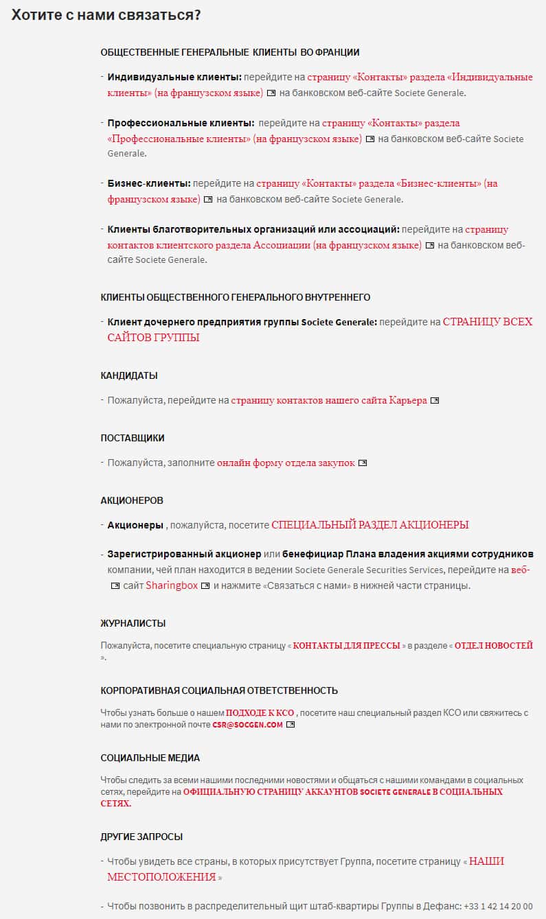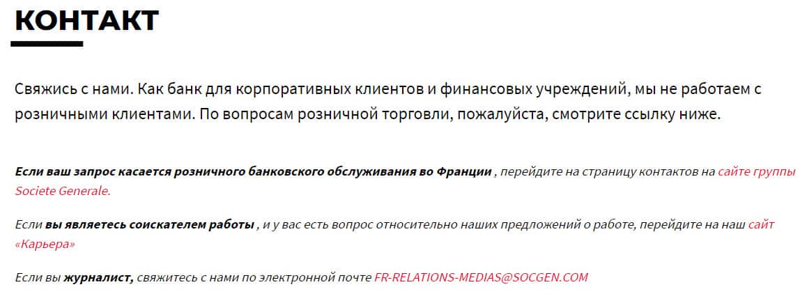Далее шарлатаны упоминают, что, если Ваш запрос касается розничного банковского обслуживания во Франции, нужно перейти на страницу их контактов в группе SGMarkets. Но на изображении внизу Вы можете увидеть уйму ссылок, а вот контактов определенных почти нет. Мошенники пытаются всячески запудрить мозги клиентам, чтоб вытащить с них лишь денег. Контакты воров: