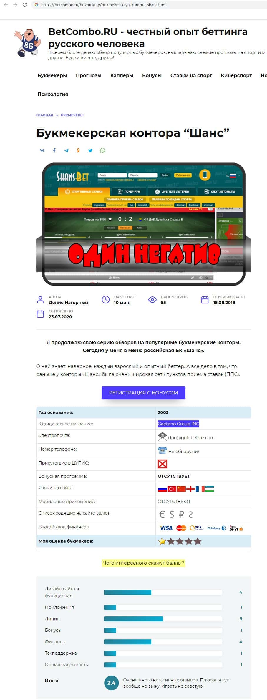 Сайт betcombo ru опубликовал информацию о фирме Шанс Бет, в которой рассказал, что о аферистах много отрицательных отзывов, а так же интернет ресурс не нащёл никаких плюсов в данной организации.
