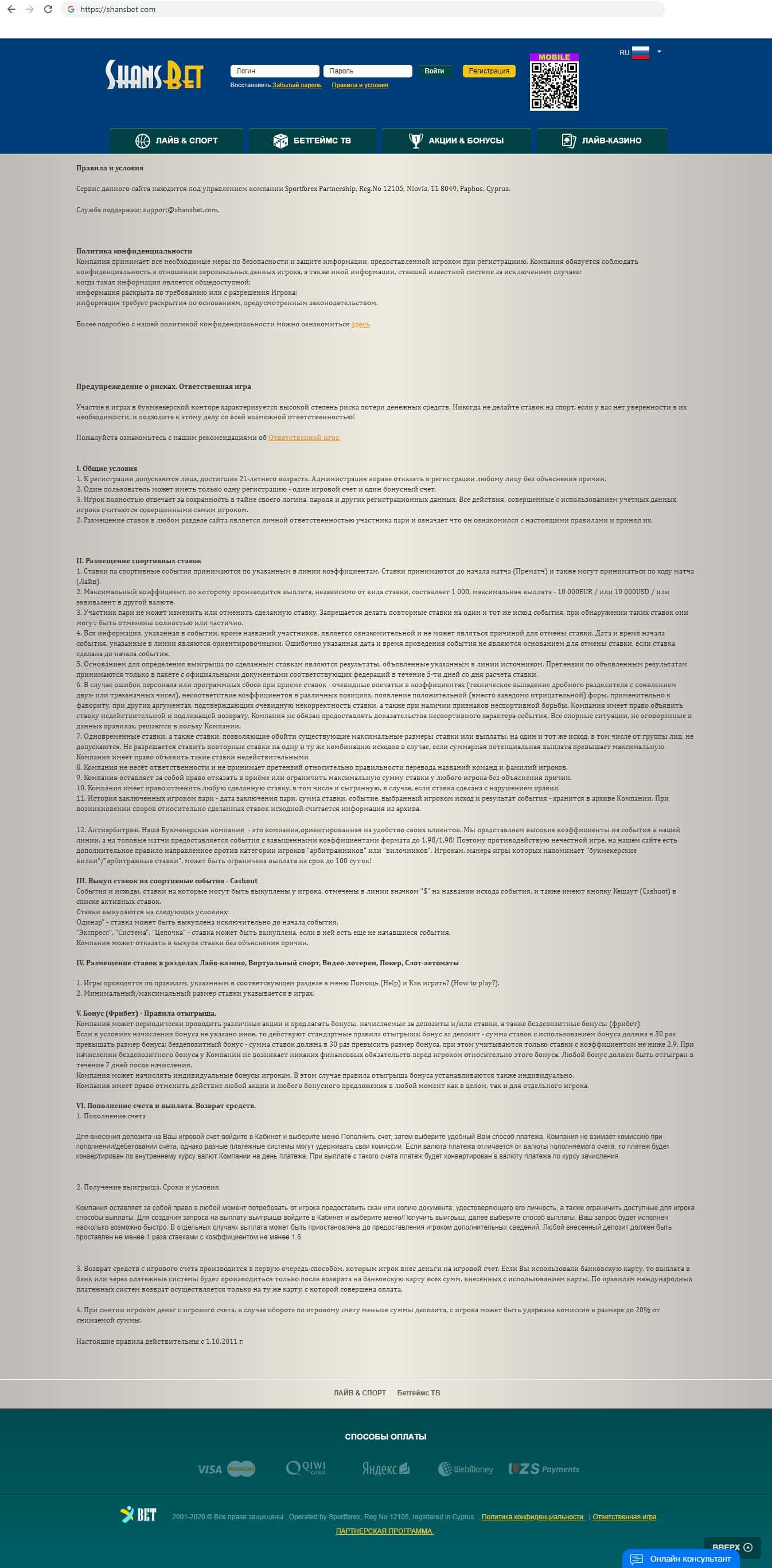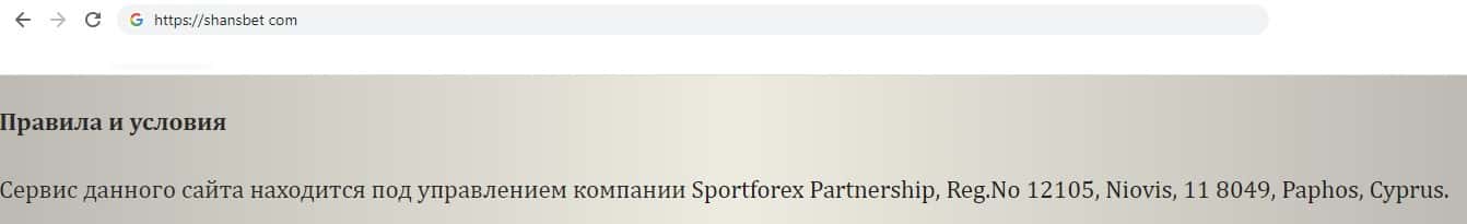 На своём главном интернет ресурсе, компания финансовых махинаторов Shans Bet указала своё юридическое лицо. Им является компания Sportforex Partnership.