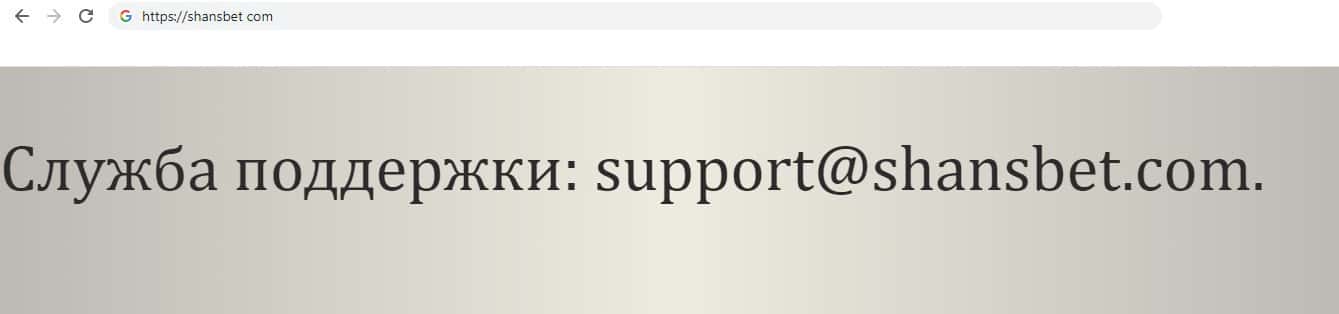 Финансовые жулики Shans Bet в качестве контактных данных указали лишь адрес электронной почты. Что является признаком мошенничества, так как компании должны указывать адрес и номер телефона. Почта мошенников: