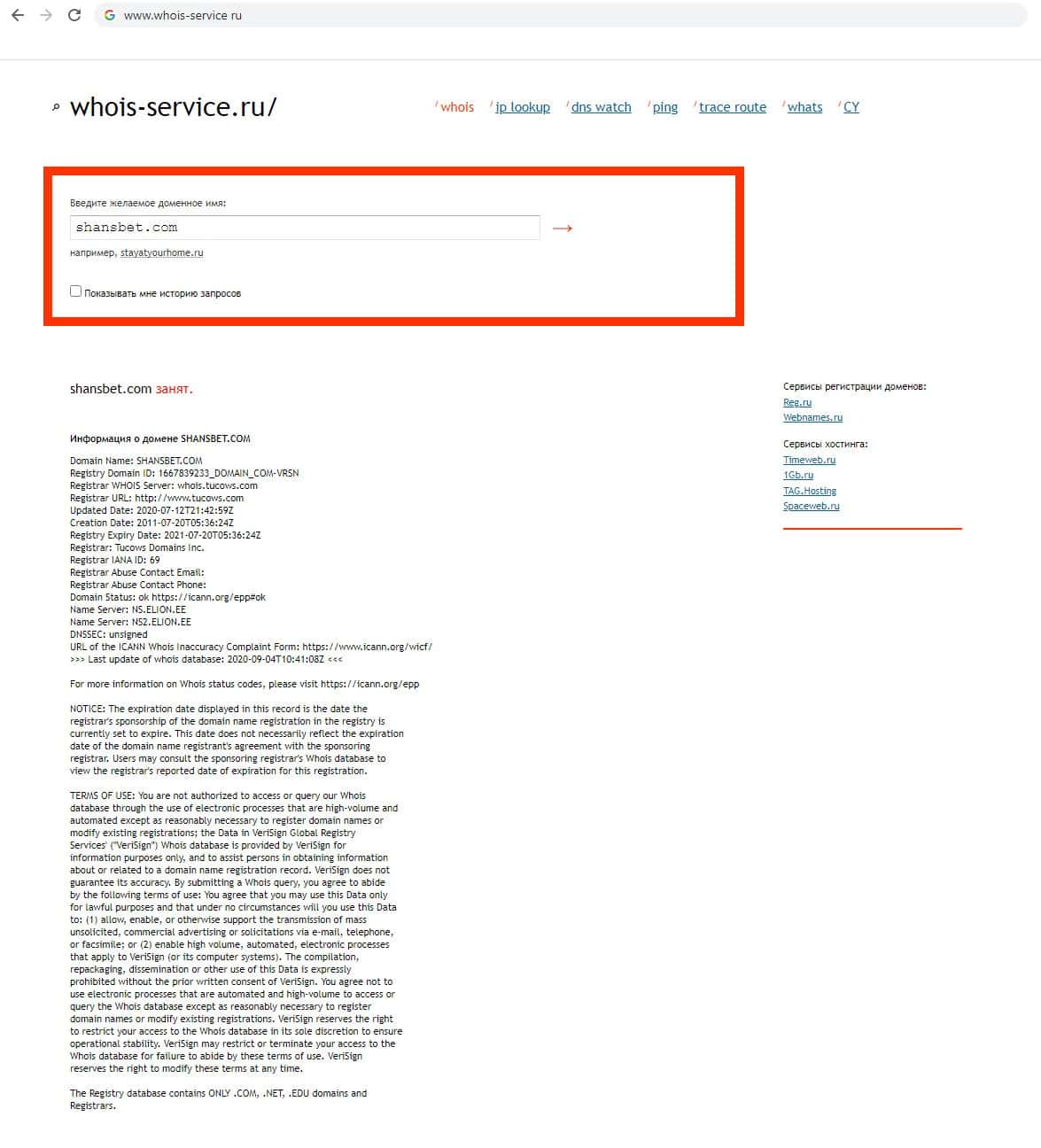 С помощью интернет ресурса whois-service ru мы проверили информацию о том, кто владеет доменом компании разводил Shans Bet, но оказалось, что фирма скрывает владельца домена.