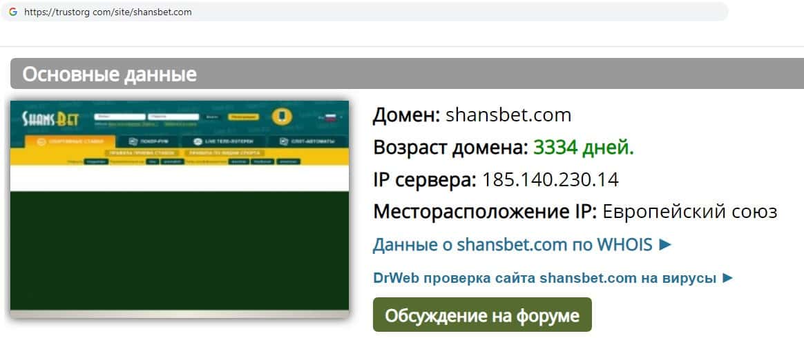 Через интернет ресурс "Доверие в Сети" мы проверили возраст компании жуликов Шанс Бет. Оказалось, что фирма аферистов обманывает интернет - пользователей более 9 лет.