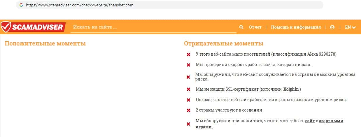 Интернет ресурс scamadviser com не смог отметить никаких положительных качеств компании махинаторов Shans Bet, но за то отметил множество недостатков данного лохотрона.