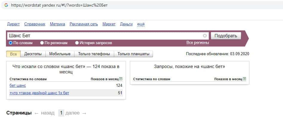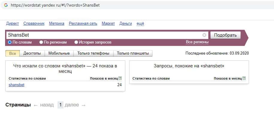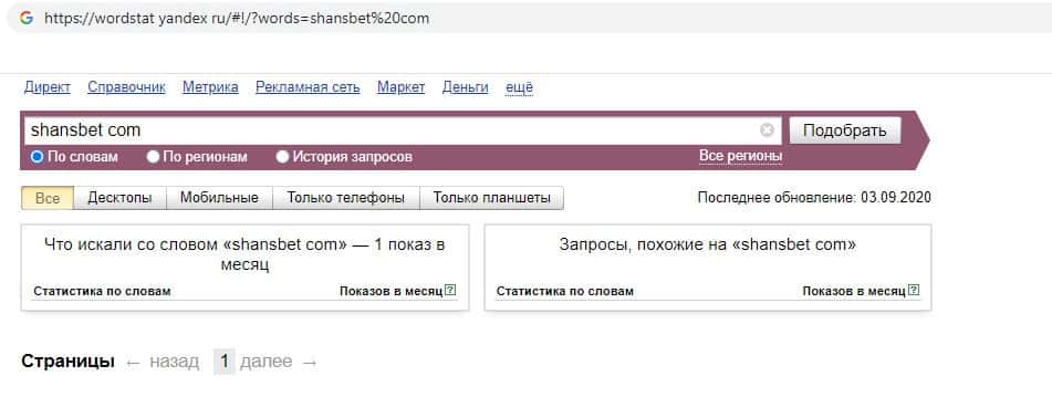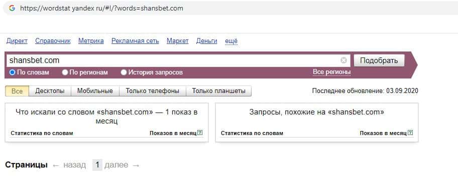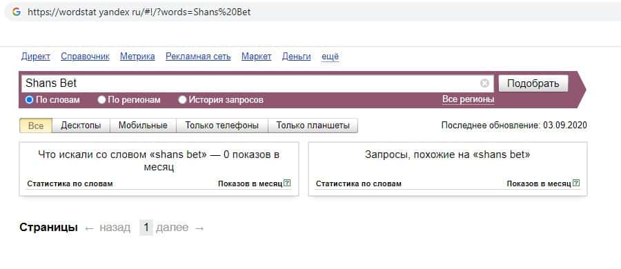 Мы проверили количество запросов компании Shans Bet в Яндексе по названию фирмы, а именно "Shans Bet". Оказалось, что данный запрос никто не выполнял в течении месяца.