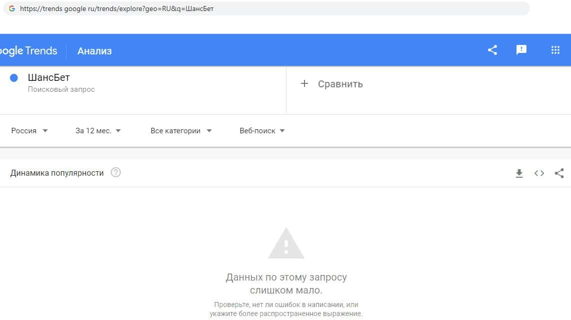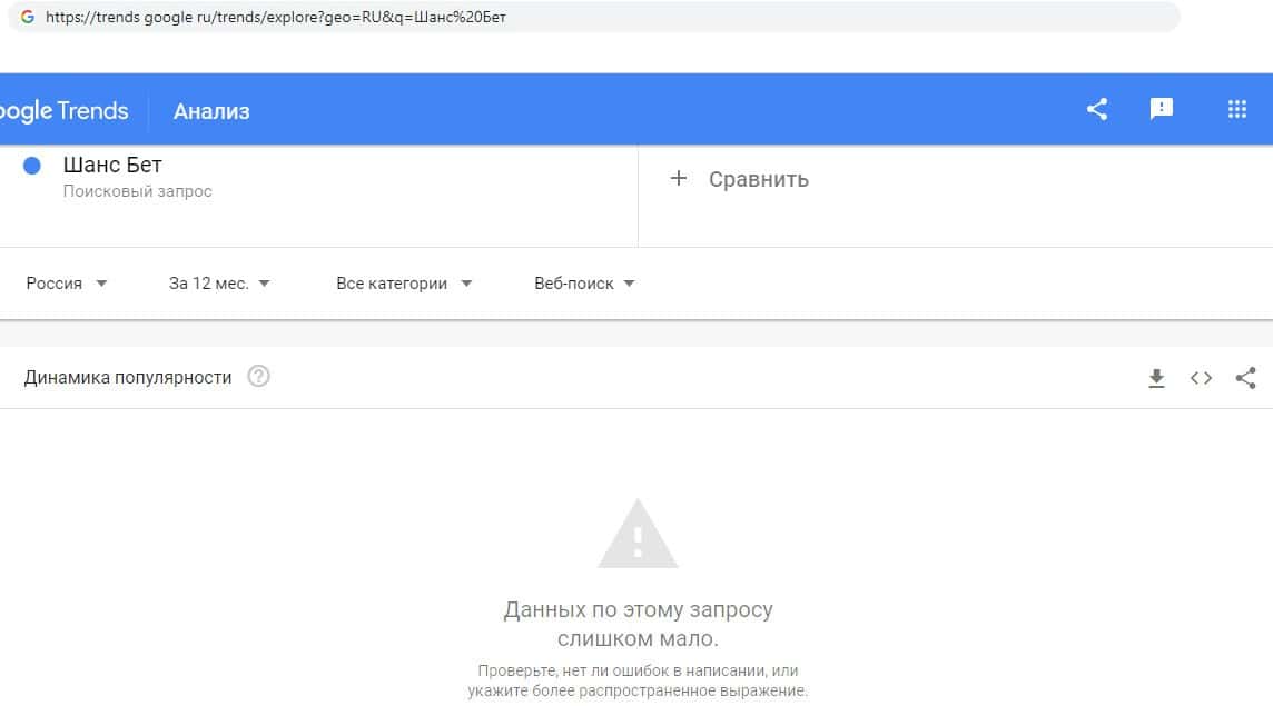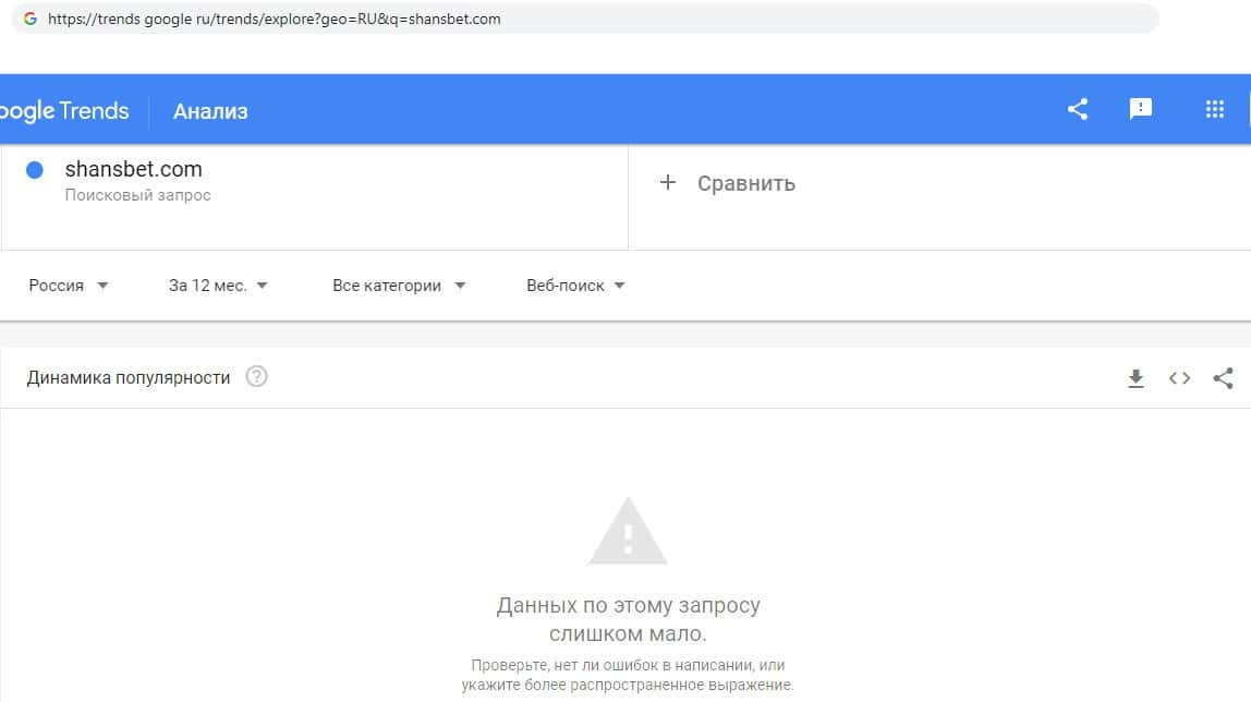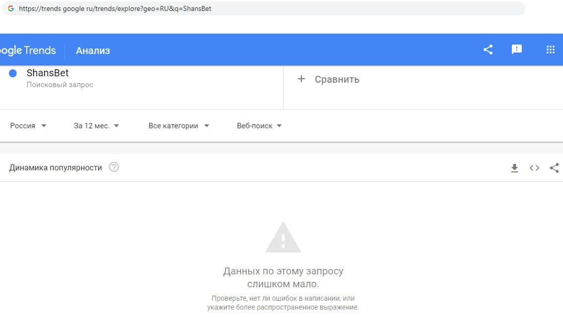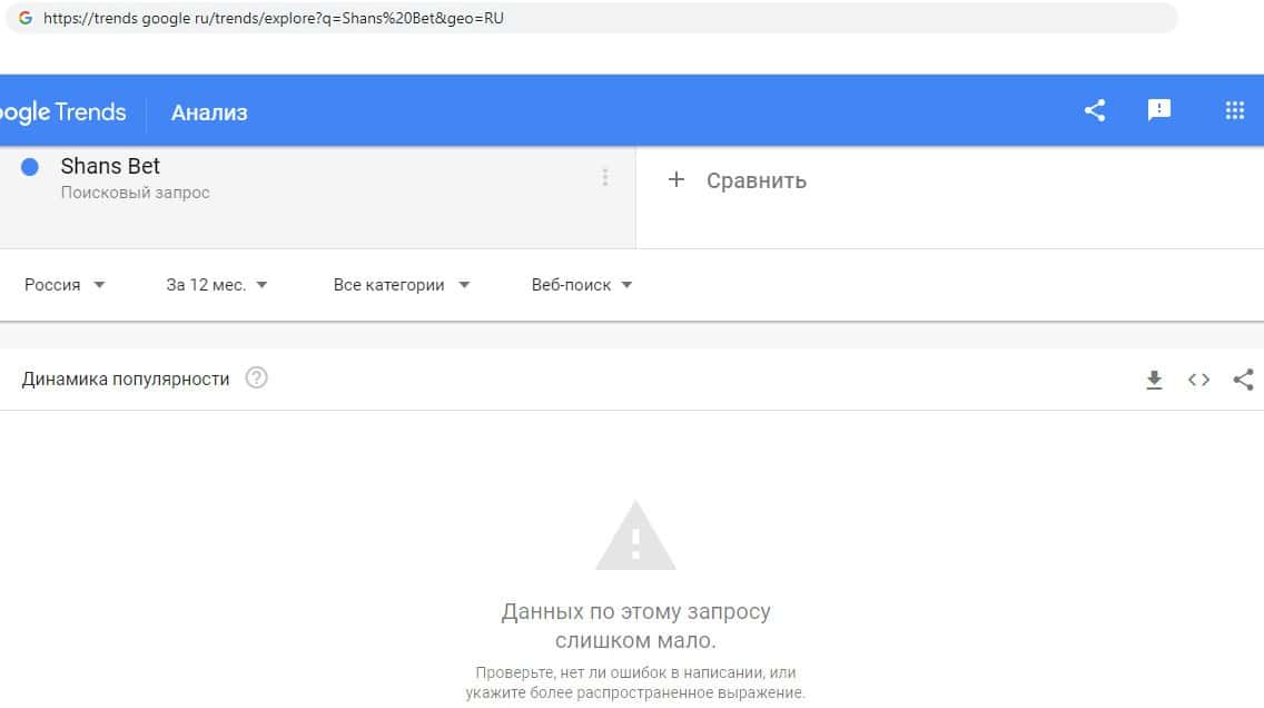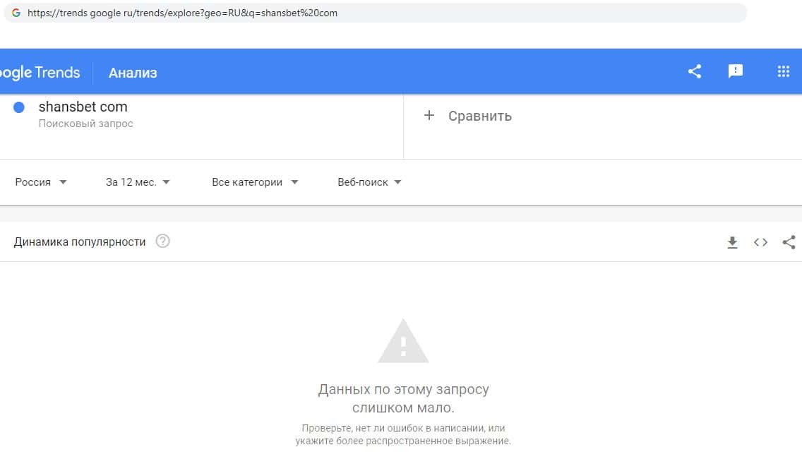 Мы проверили количество запросов компании мошенников Shans Bet в Google по названию фирмы, а именно "Shans Bet". Но данный запрос никто не выполнял.
