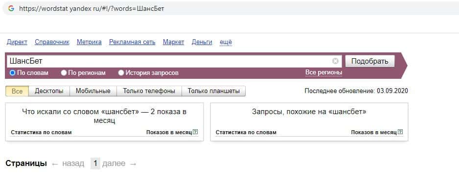 Ещё мы проверили количество запросов шарашкиной конторы Шанс Бет по русскоязычному названию но без пробела, а именно "ШансБет". Всего 2 раза пользователи выполнили данный запрос.