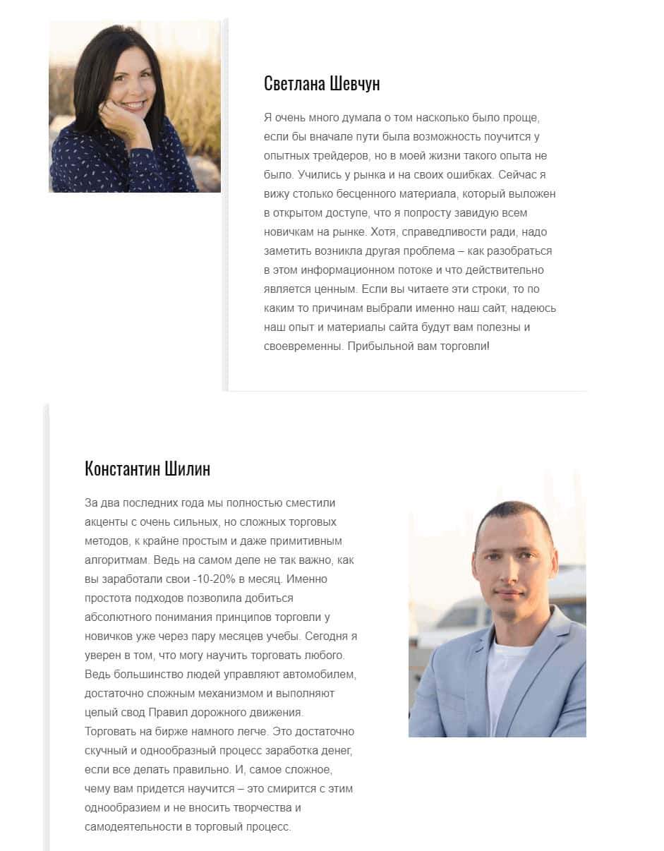 Аферисты школа трейдинга Шилин Трейд Ком качественно отличаются от своих "коллег" тем, что они имеют на своём сайте данные о неких двух трейдерах, участвующих в создании этой самой конторы. Это, в принципе, распространённая практика среди кидал, выставить себя якобы ярыми поборниками развития трейдерских навыков, когда на деле им нужны лишь ваши деньги.