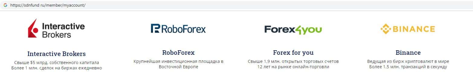 На интернет-портале жульнической конторы SDNFund в качестве партнерской программы предоставлены псевдо-брокерские конторы, которые являются мошенническими.