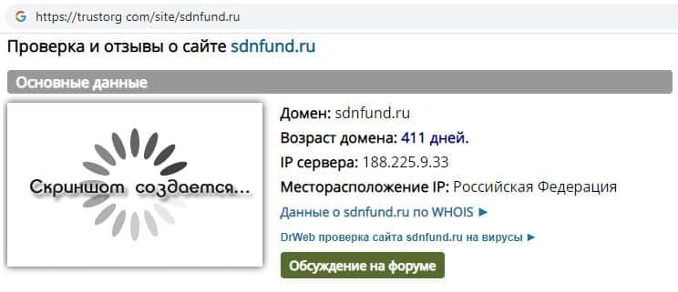 Проверка интернет-сервиса жулики SDNFund на trustorg com показала, что возраст домена к моменту написания статьи составляет 411 дней, скорее всего домен купленный.