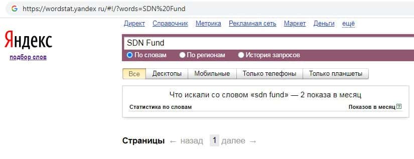 Количество брендовых запросов названия компании на английском языке с пробелом "SDN Fund" на Яндекс Вордстарт составляет 2 показа за месяц.