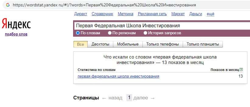 Количество запросов по бренду полного названия компании на русском языке "Первая Федеральная Школа Инвестирования" на Вордстарт Яндекс Ру