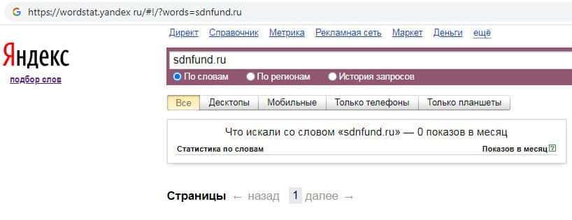 Количество запросов по бренду названия домена компании "sdnfund.ru" в поисковике Yandex вероятно равно нулю.