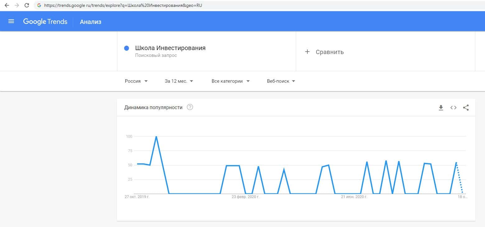 Динамика популярности бренда названия компании на русском языке с пробелом "Школа Инвестирования" в поисковике Google отображена на графике на скриншоте ниже.