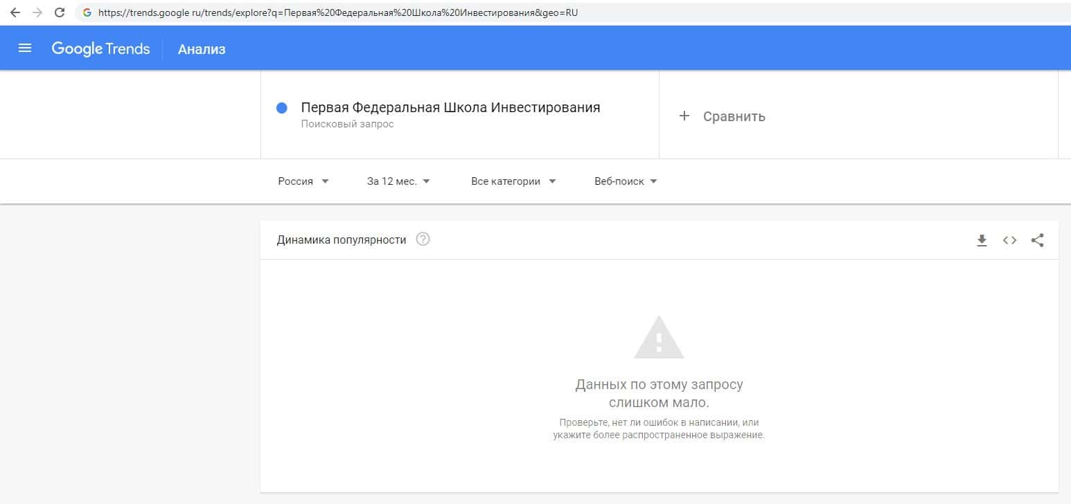 О количестве брендовых запросов полного названия компании на русском языке "Первая Федеральная Школа Инвестирования" на Гугл Трендс нет никакой информации.