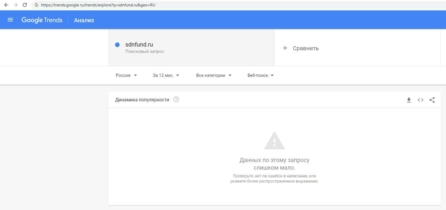 По количеству запросов по бренду названия домена компании "sdnfund.ru" на Трендс Гугл Ру данные отсутствуют.