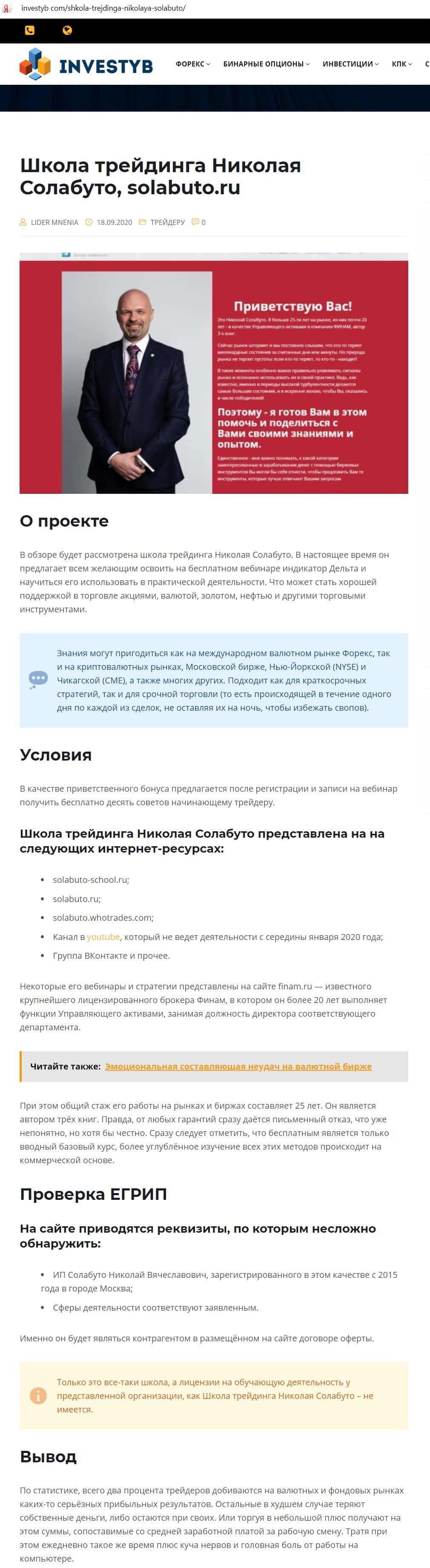 - Автор, редактор и источники информации статьи о мошенниках Школа Николая Солабуто