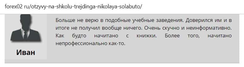 Иван пишет, что больше не верит в подобные заведения после посещения лохотрона Школа Николая Солабуто. Он не получил вообще никакой полезной информации.