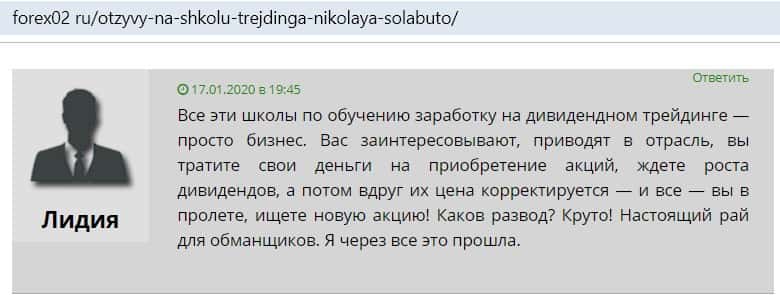 Лидия осталась недовольна обучением в Школа Николая Солабуто. Она говорит, что это развод с целью получить деньги от пользователей, вот и весь бизнес.