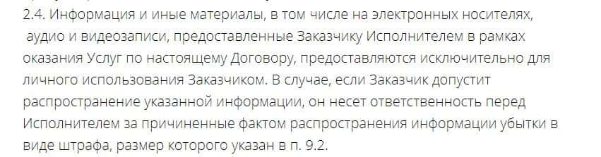 В пункте 2.4. договора указано, что с пользователя может быть взыскан штраф, если выясниться, что он причинил вред компании, распространяя видеокурсы.