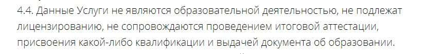 Пункт 4.4 клиентского соглашения говорит о том, что организация Школа Николая Солабуто не предоставляет образовательных услуг и не выдает аттестаты или сертификаты.