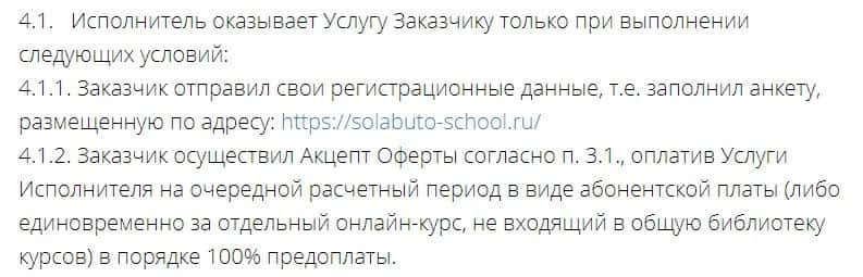 Пункт 4.1 клиентского соглашения Школа Николая Солабуто предупреждает, что видеоуроки будут предоставлены пользователю только после стопроцентной оплаты курса.
