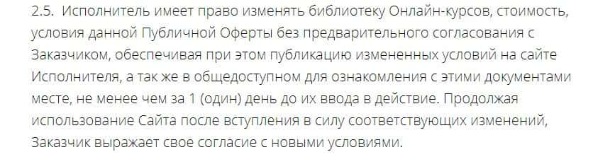 В следующем пункте говорится, что компания Школа Николая Солабуто может изменять условия настоящего договора, а также наполнение сайта по собственному усмотрению.