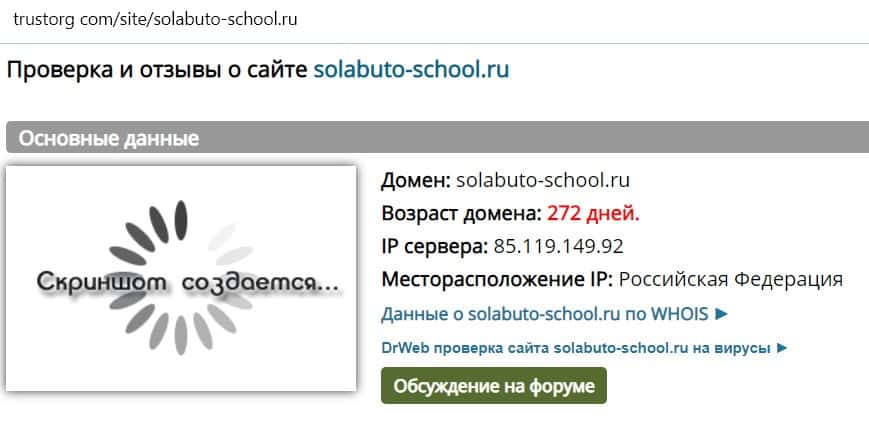 Возраст доменного имени сайта Solabuto-School Ru составляет 272 дня. Если верить этим данным, то мошенники обманывают людей уже почти год.