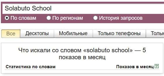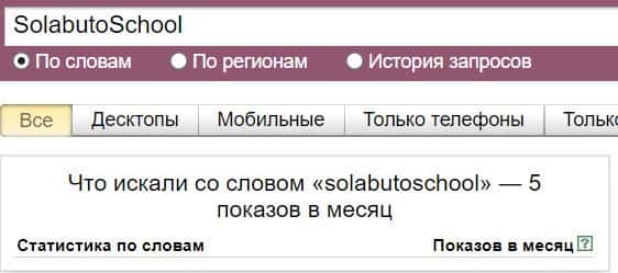 Название мошеннической конторы "SolabutoSchool", написанное на английском языке, пользователи искали в системе Яндекс нечасто - всего лишь 5 показов.