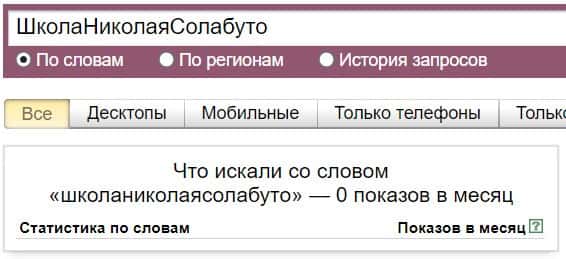 Посмотрим, сколько раз люди искали название бренда "Школа Николая Солабуто" на русском языке с пробелами. Незначительное количество раз.