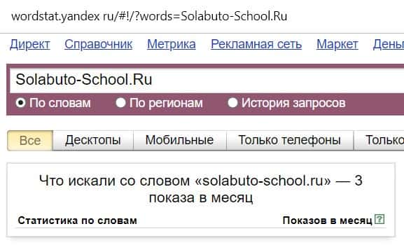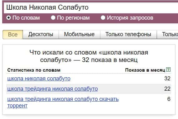 Посмотрим, сколько раз люди искали название бренда "Школа Николая Солабуто" на русском языке с пробелами: результат 32 показа.