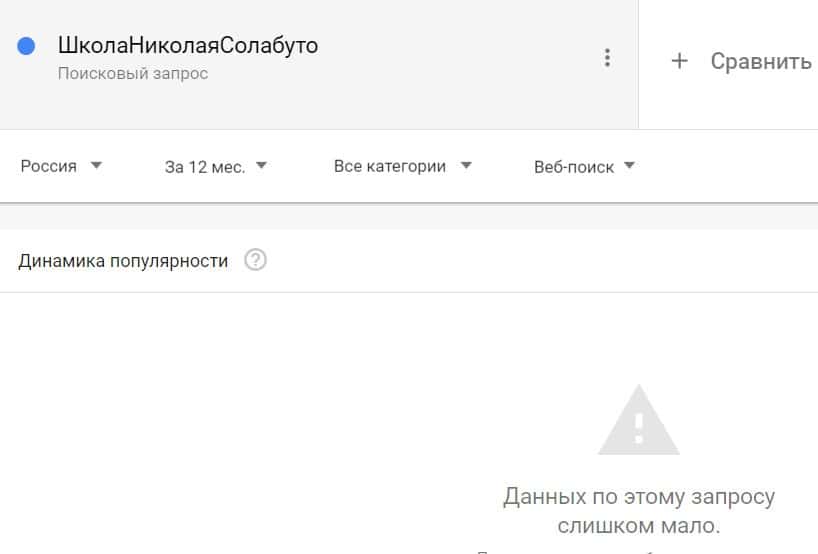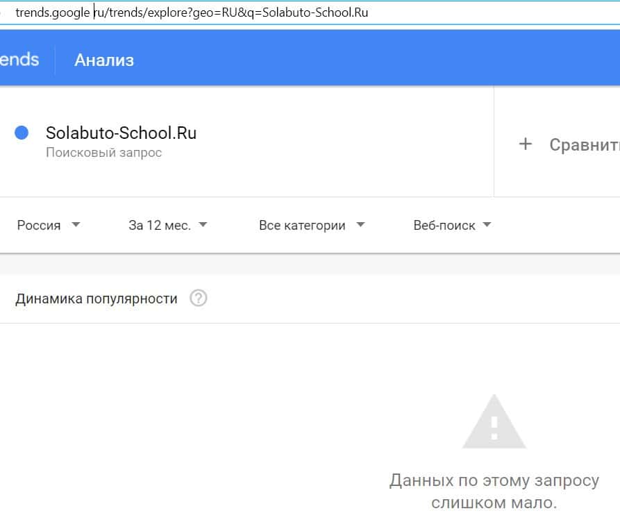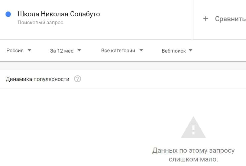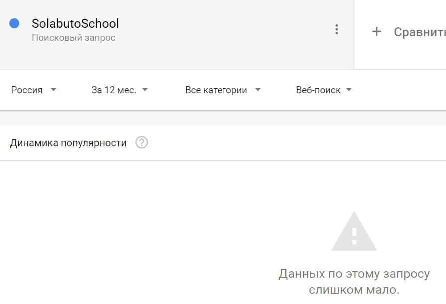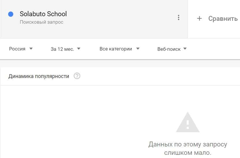 Посмотрим, насколько популярно название бренда "SolabutoSchool", написанное на английском языке. Данных по этому запросу нет, так как никто не искал этот бренд в Гугл.