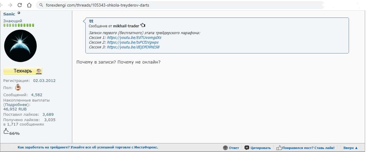 Человек интересуется, почему обучение у жуликов Школа трейдеров ДАРТС проводится в записи, а не в онлайне
