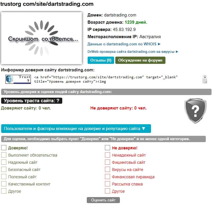 Есть такой известный оценочный портал в рунете, как "Доверие в Сети". На нем каждый желающий человек может поставить свою оценку работе любой компании. Так вот тут удалены все оценки работы конторы DartsTrading. А это должно сразу же насторожить вас, потому что сейчас есть отзывы практически о всех компаниях.