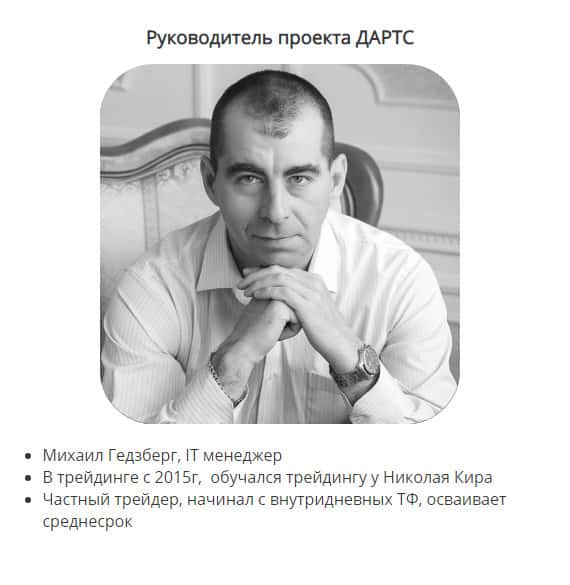 На сайте Школа трейдеров ДАРТС указано имя руководителя. Это некий Михаил Гедзберг. Но об этом человеке, кроме нескольких строчек на самом их сайте, очень мало информации. Закрадываются очень большие сомнения в том, что у него есть компетенция и он может людей чему-то учить. Лучше быть с этим осторожнее.