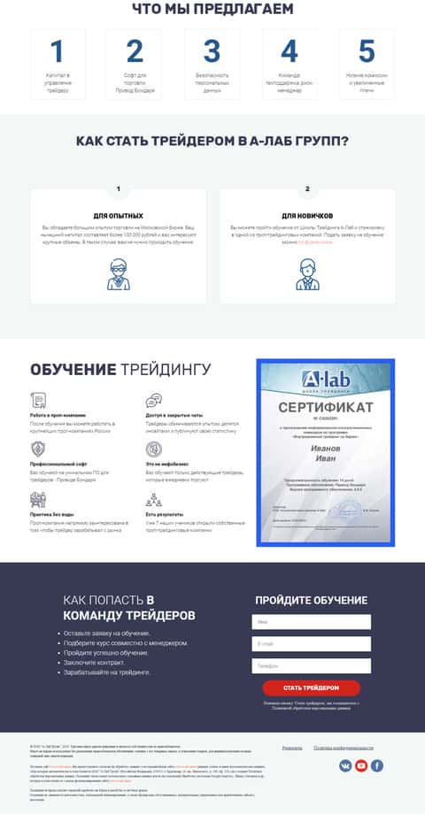 Во второй части сайта нас пытаются уговорить записаться на учебные курсы, и соответственно это все стоит не малую сумму денег. По окончанию уроков, шулера Школа Трейдинга А-Лаб предлагают сертификат, который имеет якобы международный уровень. На самом деле вас с ним не впустят ни в какую нормальную компанию.