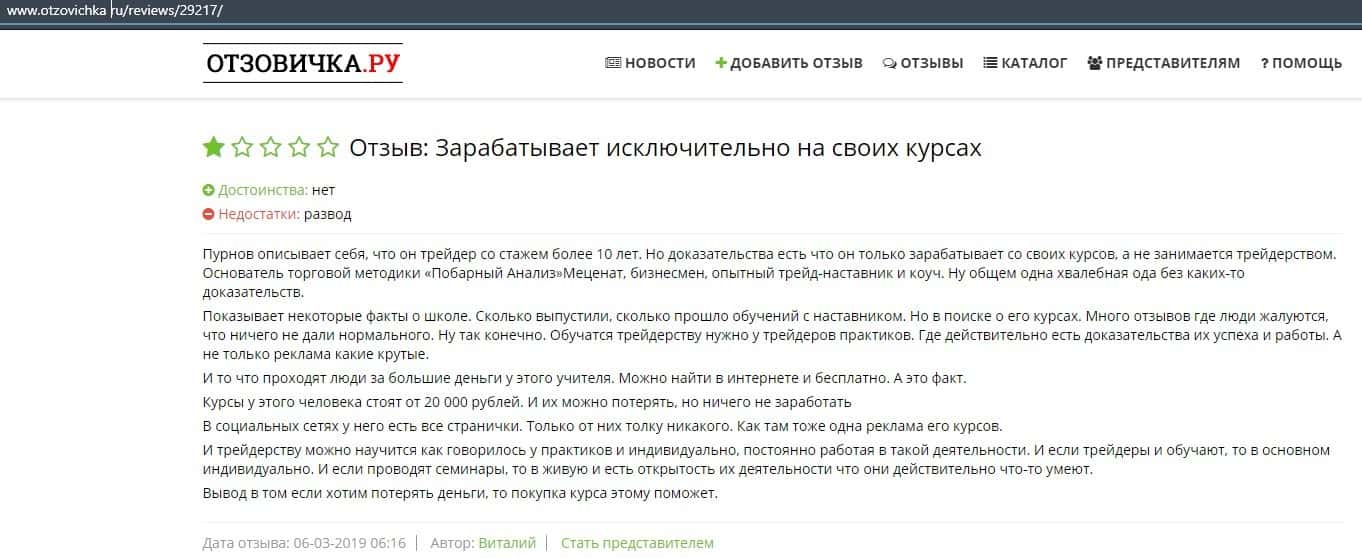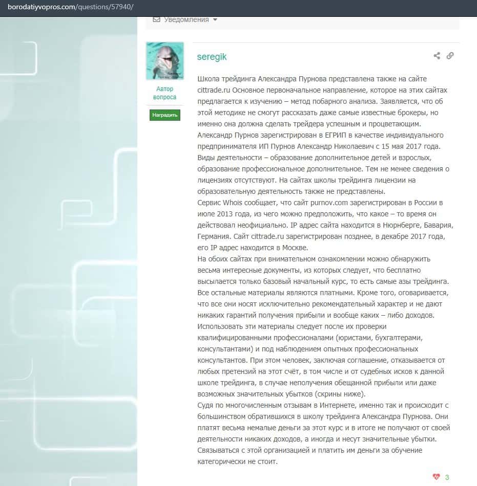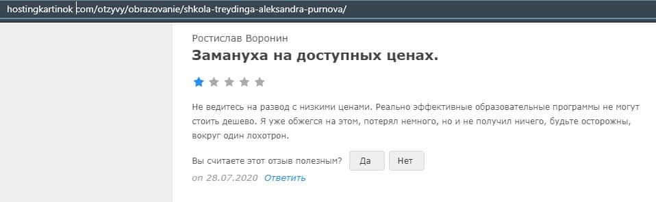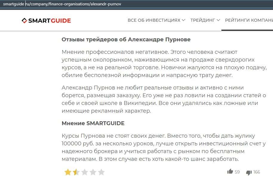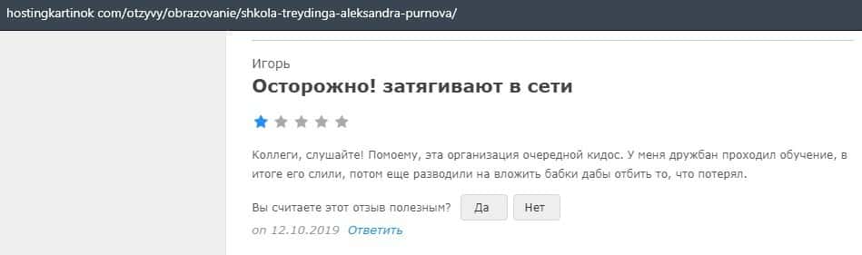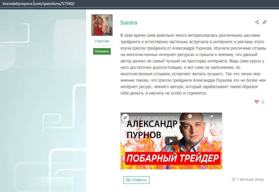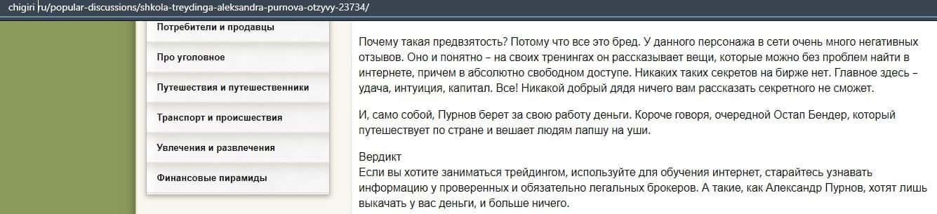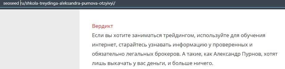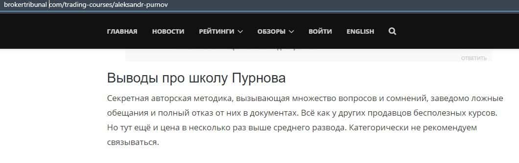 Еще одна статья была найдена в сети интернет о деятельности лохотрона Школа трейдинга Александра Пурнова. Курсы, которые они продают не стоят тех денег, которые они просят.