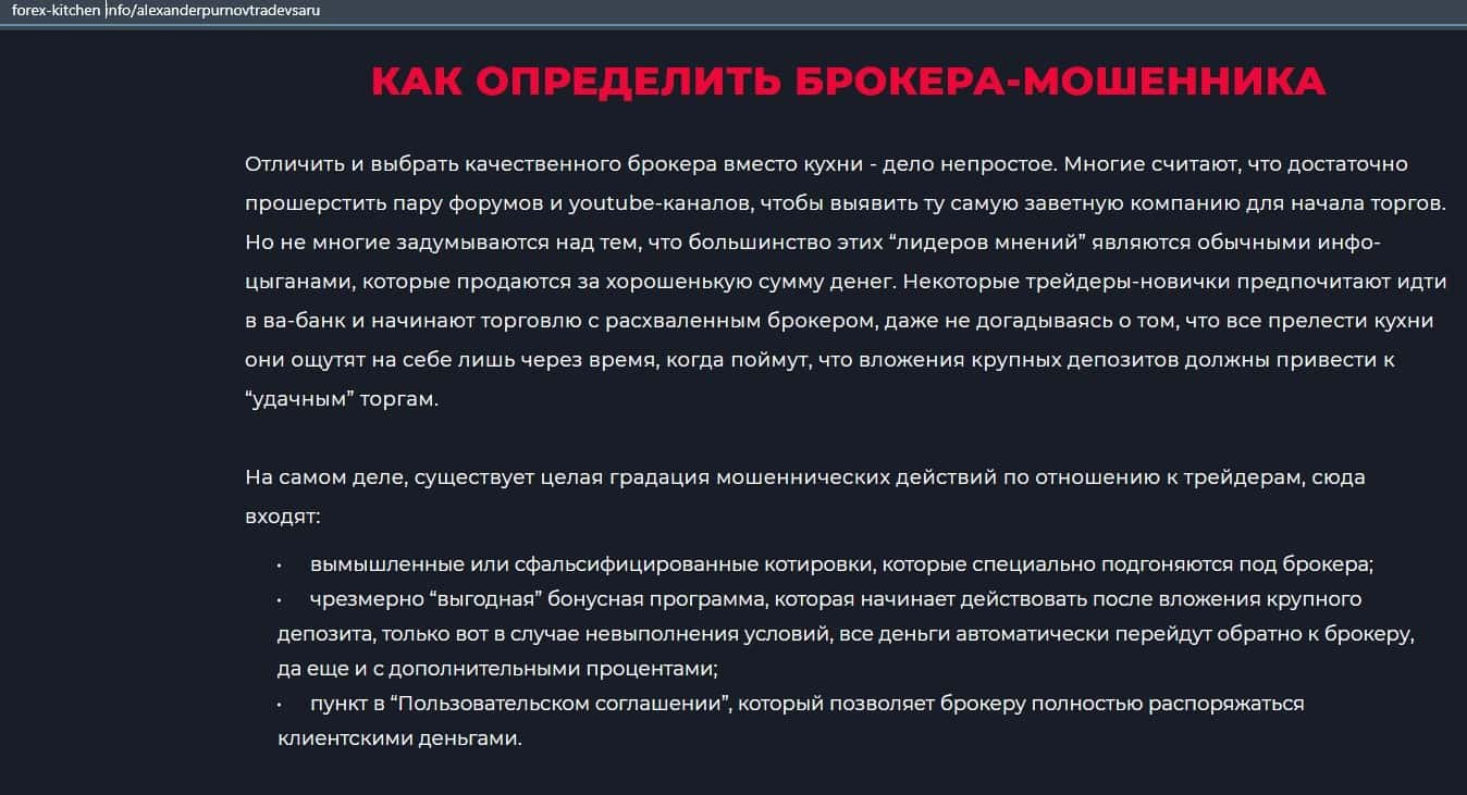Контора AlexanderPurnov попала в обзор одного из ресурсов, где ее подозревают в мошеннических действиях из-за связи с некоторыми кухонными брокерами.