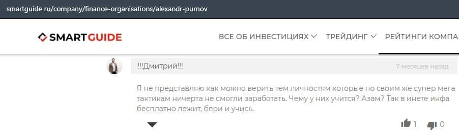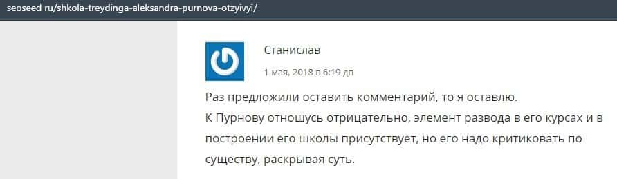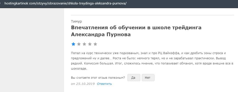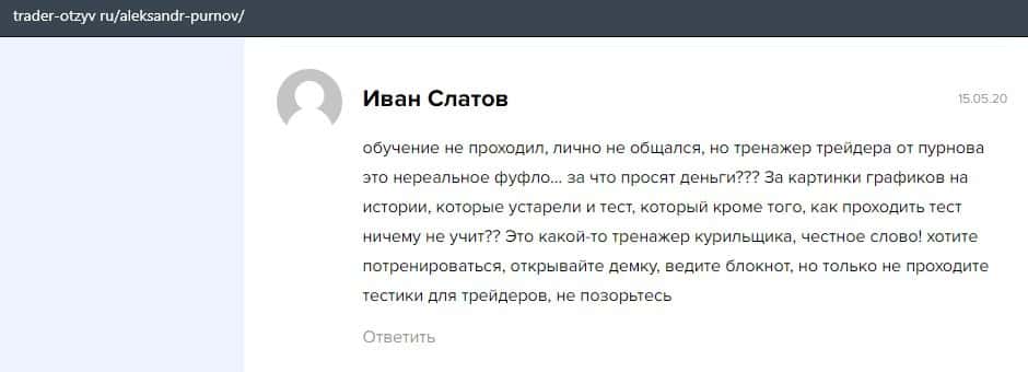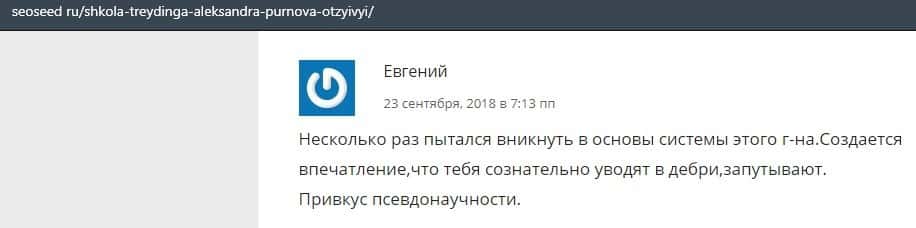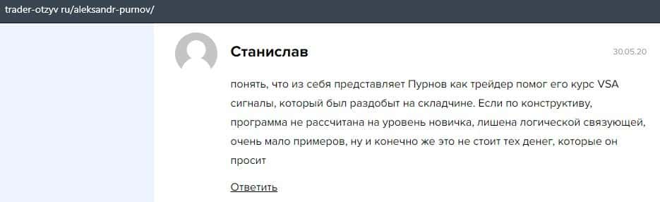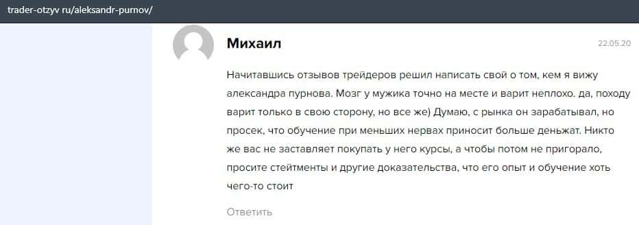 Очередной пользователь сети сделал вывод, что он относится к Школа трейдинга Александра Пурнова отрицательно, потому что они по существу ничему не учат.