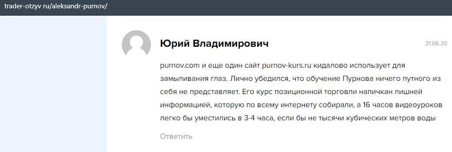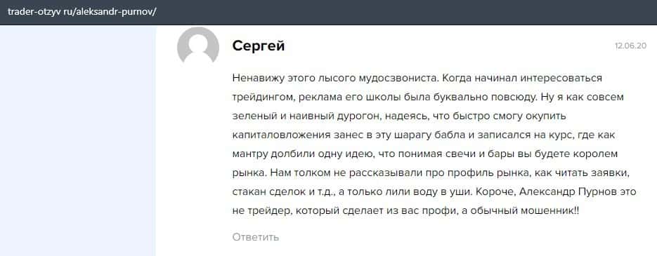 Далее представлен отзыв от человека, который не сразу понял, что Школа трейдинга Александра Пурнова его разводит на деньги. Он купил курс обучения, но ничего не получил.